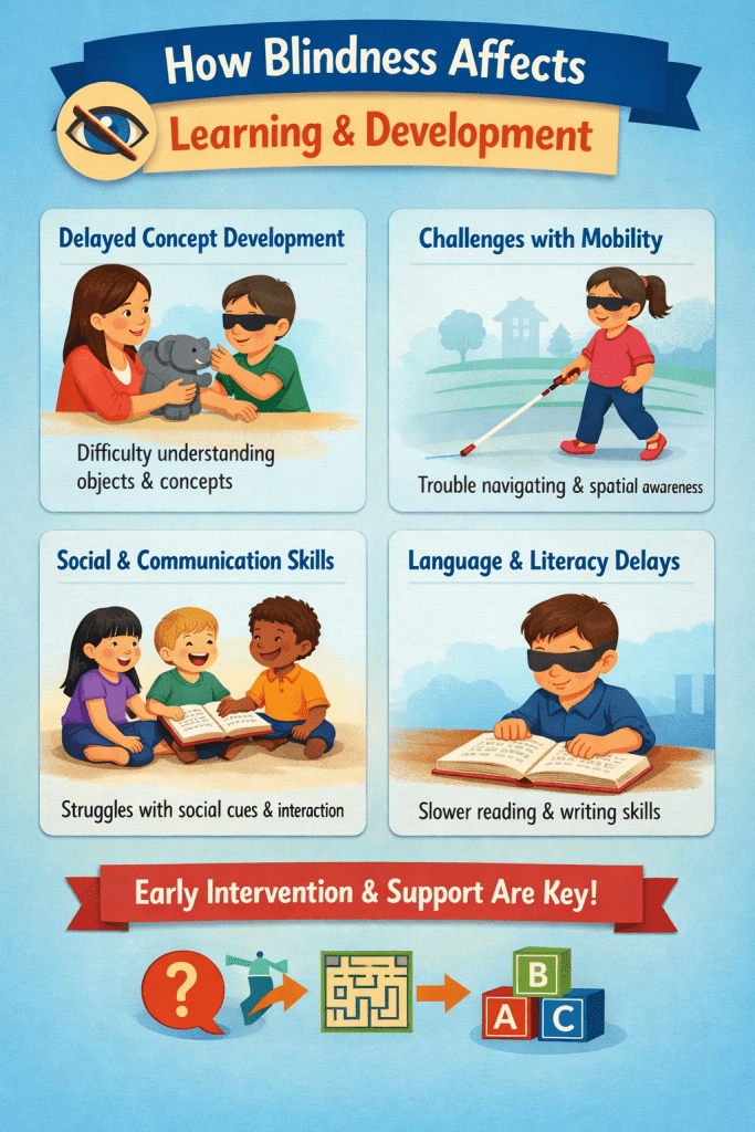 Blindness significantly affects a child’s learning process and overall development, especially when appropriate support systems are not in place. Vision plays a central role in early learning, so its absence requires alternative methods, tools, and teaching strategies to ensure full participation in education and daily life. However, with proper support, children with blindness can learn effectively and achieve their full potential.