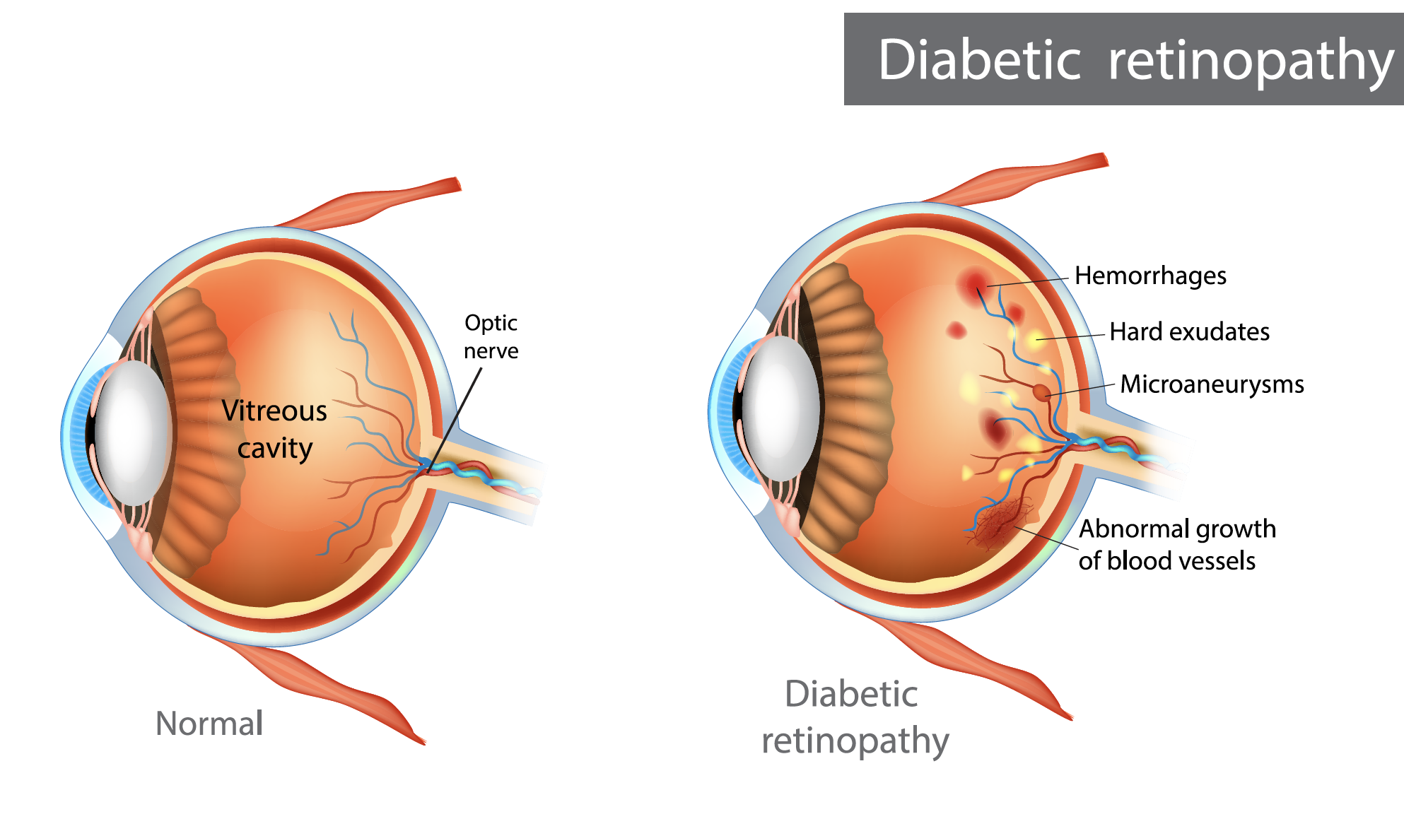 Over time, too much sugar in your blood can lead to the blockage of the tiny blood vessels that nourish the retina, cutting off its blood supply. As a result, the eye attempts to grow new blood vessels. But these new blood vessels don’t develop properly and can leak easily.